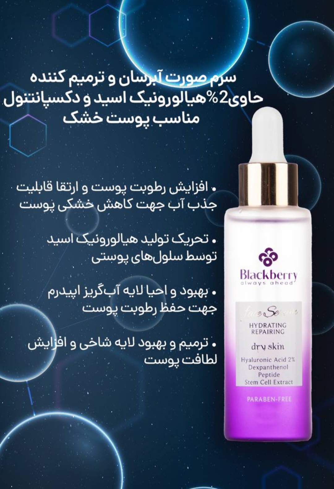 سرم صورت آبرسان و ترمیم کننده بلک بری حاوی2%هیالورونیک اسید و دکسپانتنول مناسب پوست خشک